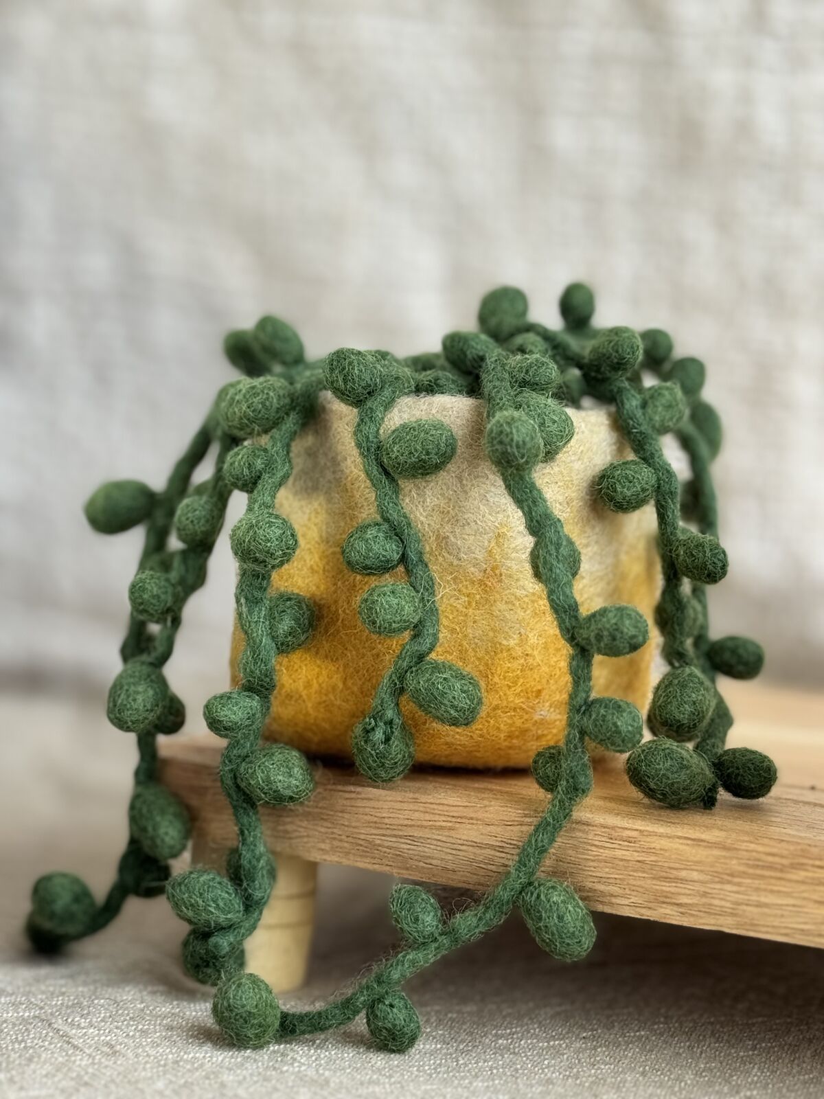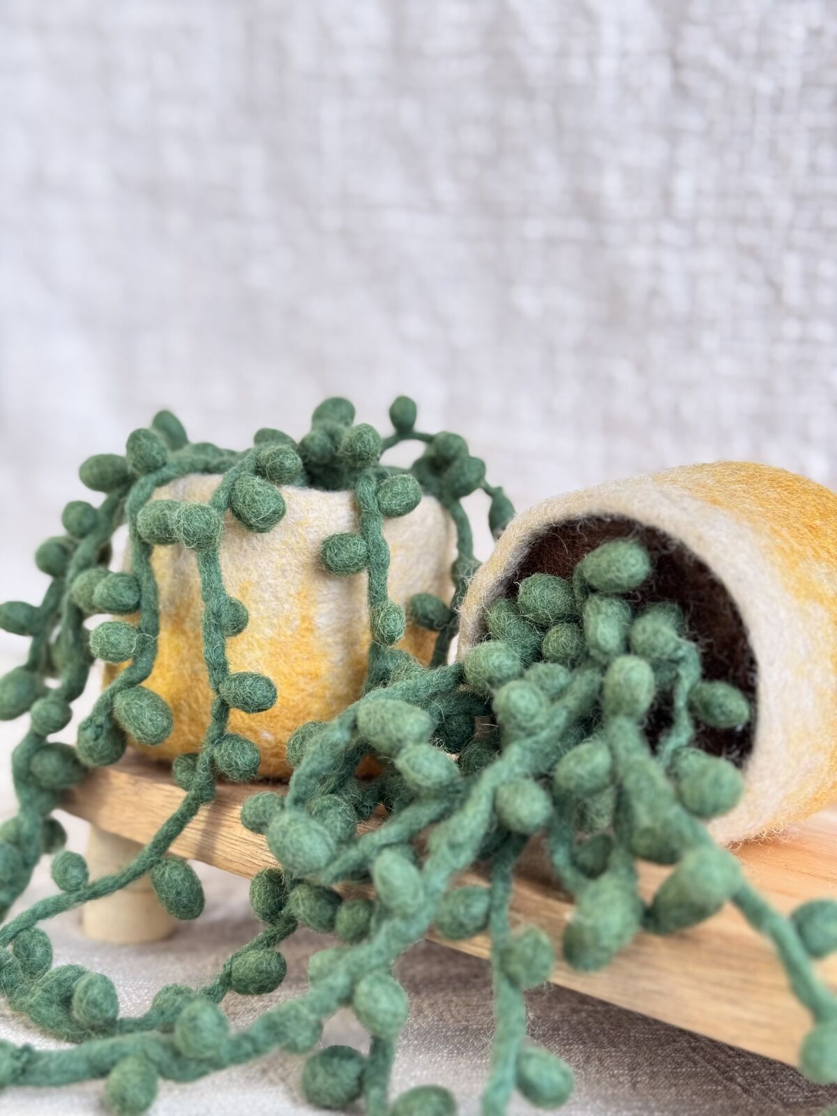 The Felt Senecio Rowleyanus Variegata, more commonly known as the String of Pearls, is a playful, tactile interpretation of the trailing succulent vine. Handcrafted from soft felt, this plant encourages sensory exploration, imaginative play, and early learning, supporting EYLF outcomes such as identity, wellbeing, confidence, and communication, while introducing children to the concept of plant growth and responsibility in a safe, mess-free way. Its soft, bead-like leaves dangle like real pearls, offering a fun, interactive way for children to explore the natural world.