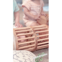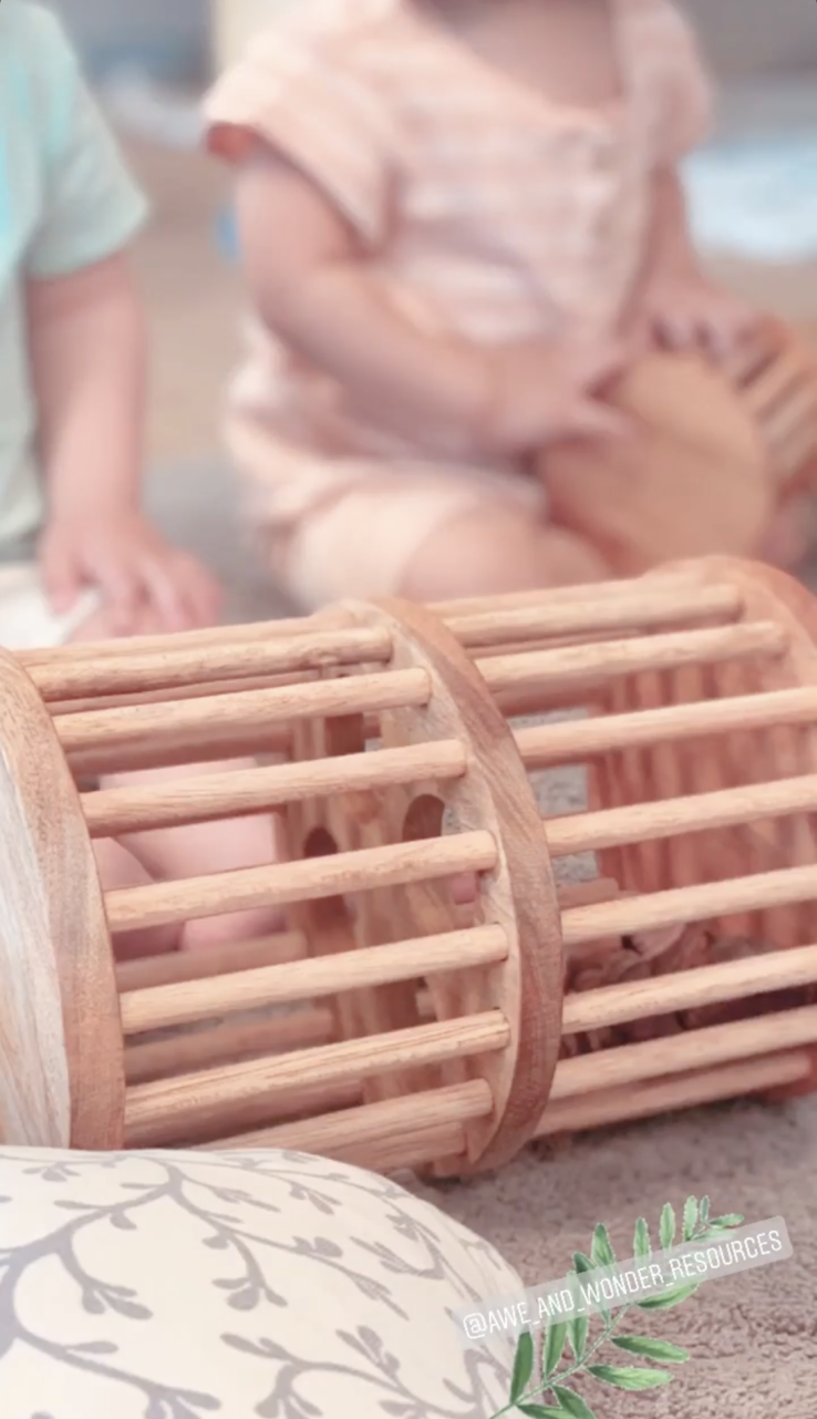 The youngiana gumnuts are encased in a handcrafted timber cage with two separate compartments. The layer between the two compartments has holes in it which allows the youngiana gumnuts to move between the cages when moved, creating a similiar effect to that of a rain maker. When rolled along the ground the youngiana gumnuts roll over the dowels in the cage creating a totally different sound and learning adventure.
