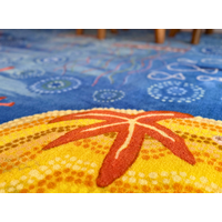 This bright playful contemporary piece is named Down Under The Sea. With some of our beautiful Kep Barna which means ‘Water Animals‘ in Noongar; It features a moort ‘family‘ of Djeli-DjilDjit ‘ Jelly Fish‘, Djinda-Djildjit ‘starfish‘ and a cheeky Karil ‘Crab‘ chasing boola-boola Djildjit ‘many-many Fish‘.