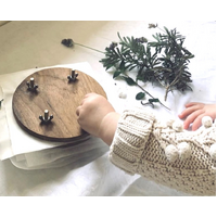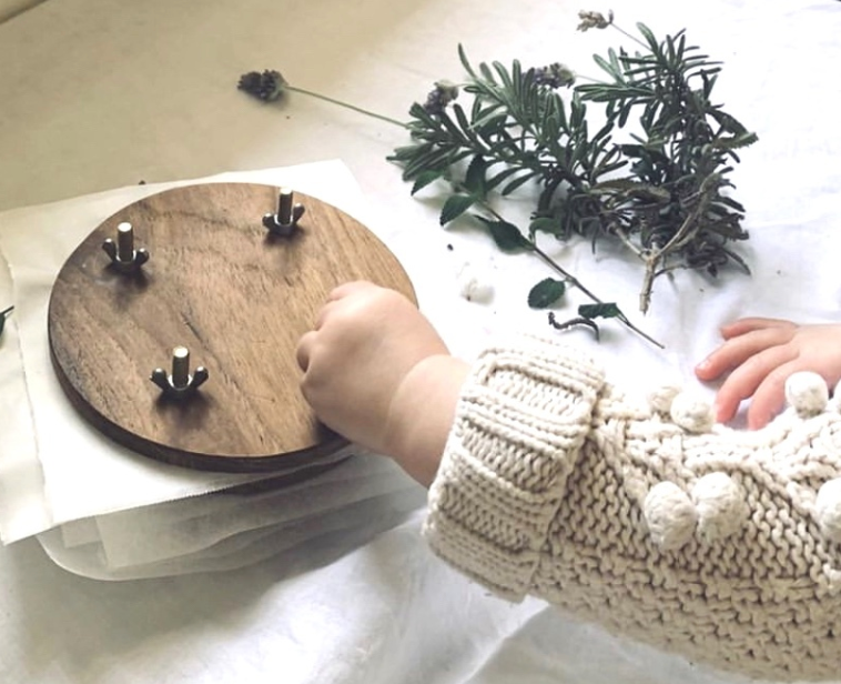 With this child-friendly press, children can place species of flowers, herbs, or grasses between the recycled cardboard and timber rounds. Once the species are in place, the press is reassembled by tightening the wing nuts.
