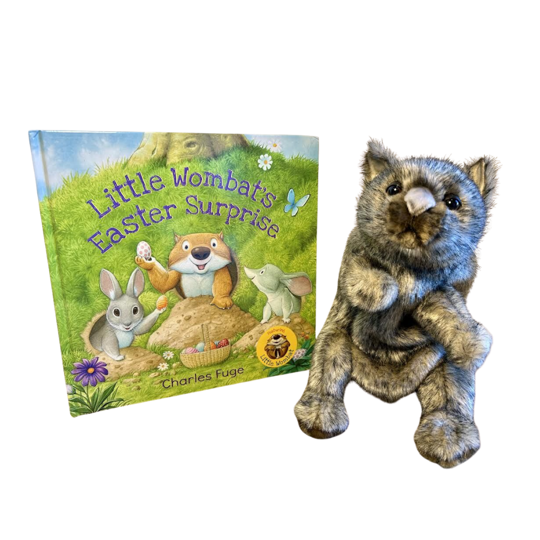 This bundle includes the book 'LIttle Wombat's Easter Surprise' and Wombat Hand Puppet
