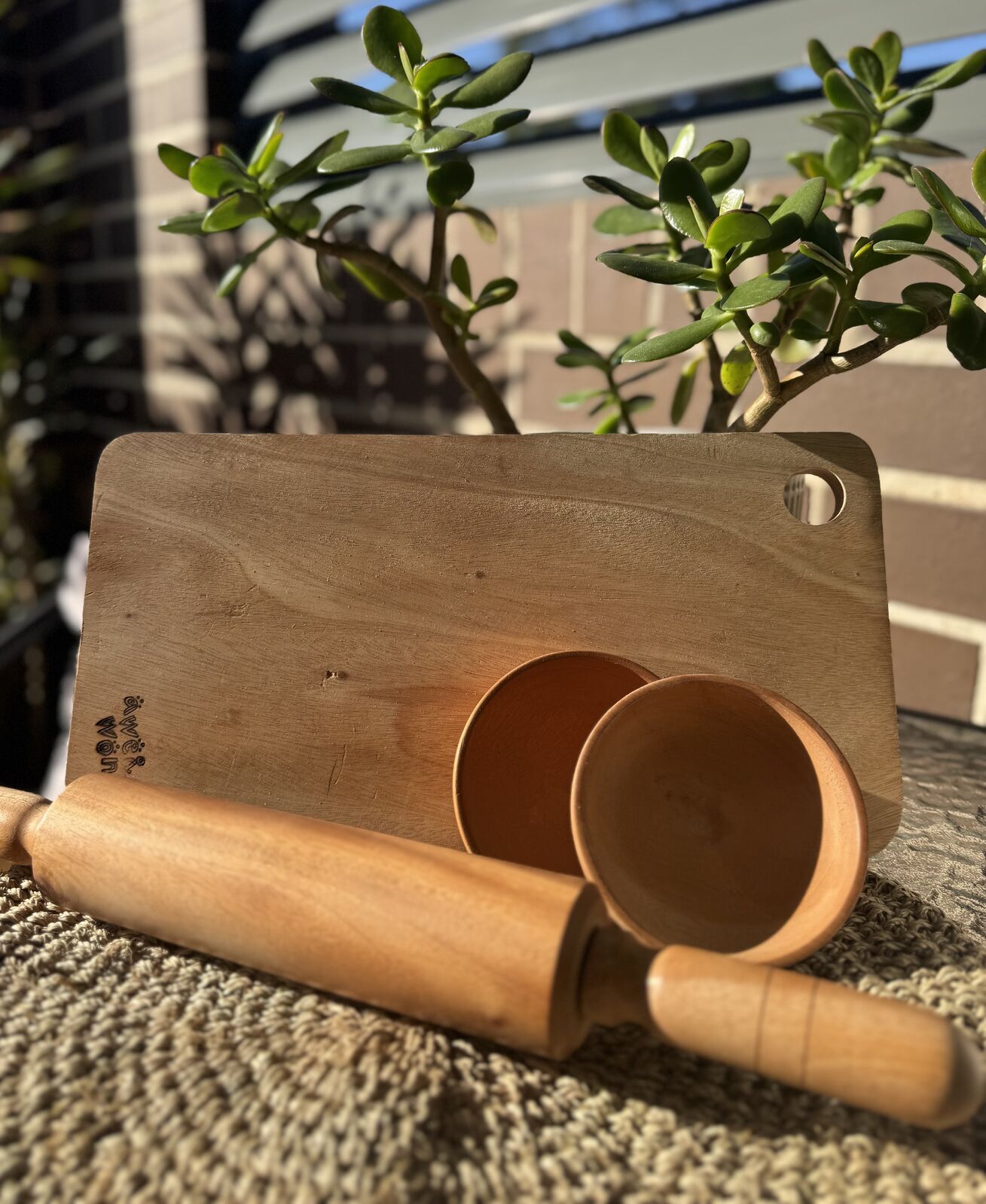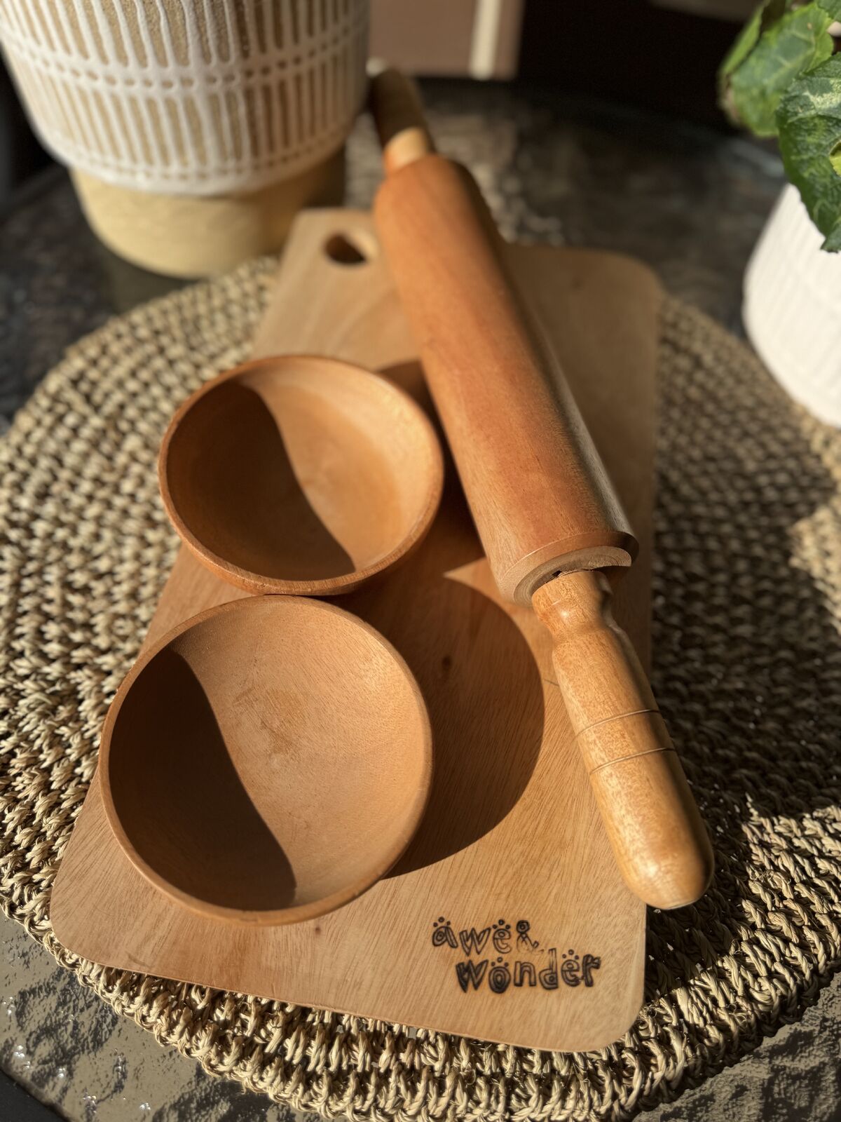 This Dough Board & Bowls Set is designed to support open-ended, hands-on play that invites children to explore, create and imagine. Featuring a smooth wooden board, rolling pin and wooden bowls, this set encourages children to roll, press, pinch, scoop and shape play dough at their own pace. As children experiment with textures and tools, they build fine-motor strength, coordination and confidence while engaging in calm, focused play. The bowls can be used to sort dough pieces, collect natural loose parts or mix materials, supporting early problem-solving and mathematical thinking through filling, emptying and comparing. Perfect for home corners, learning spaces or sensory play, this timeless wooden set promotes creativity, independence and meaningful play experiences that grow with the child.