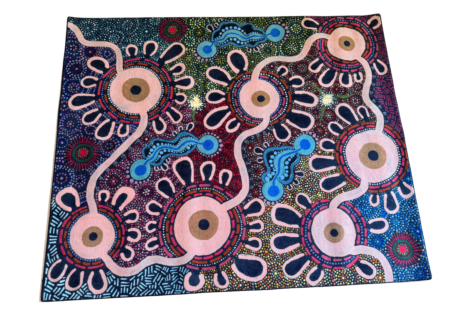 This piece is called Yoka Dandjoo; which means ‘Women Together‘ in Noongar. The artwork represents Women Connecting to Country and is inspired by my Mum, Nan, Aunties, Cousins and all the women in my family coming together in Djilba Season. It features Eucalypt and Bottlebrush blossoms, green and blue tones showing the green-ness of the land and full rivers, lakes and streams from the rains in Makuru Season. With shades of pink, purple, red and yellow to symbolise all of our wildflowers in bloom during Djilba Season.