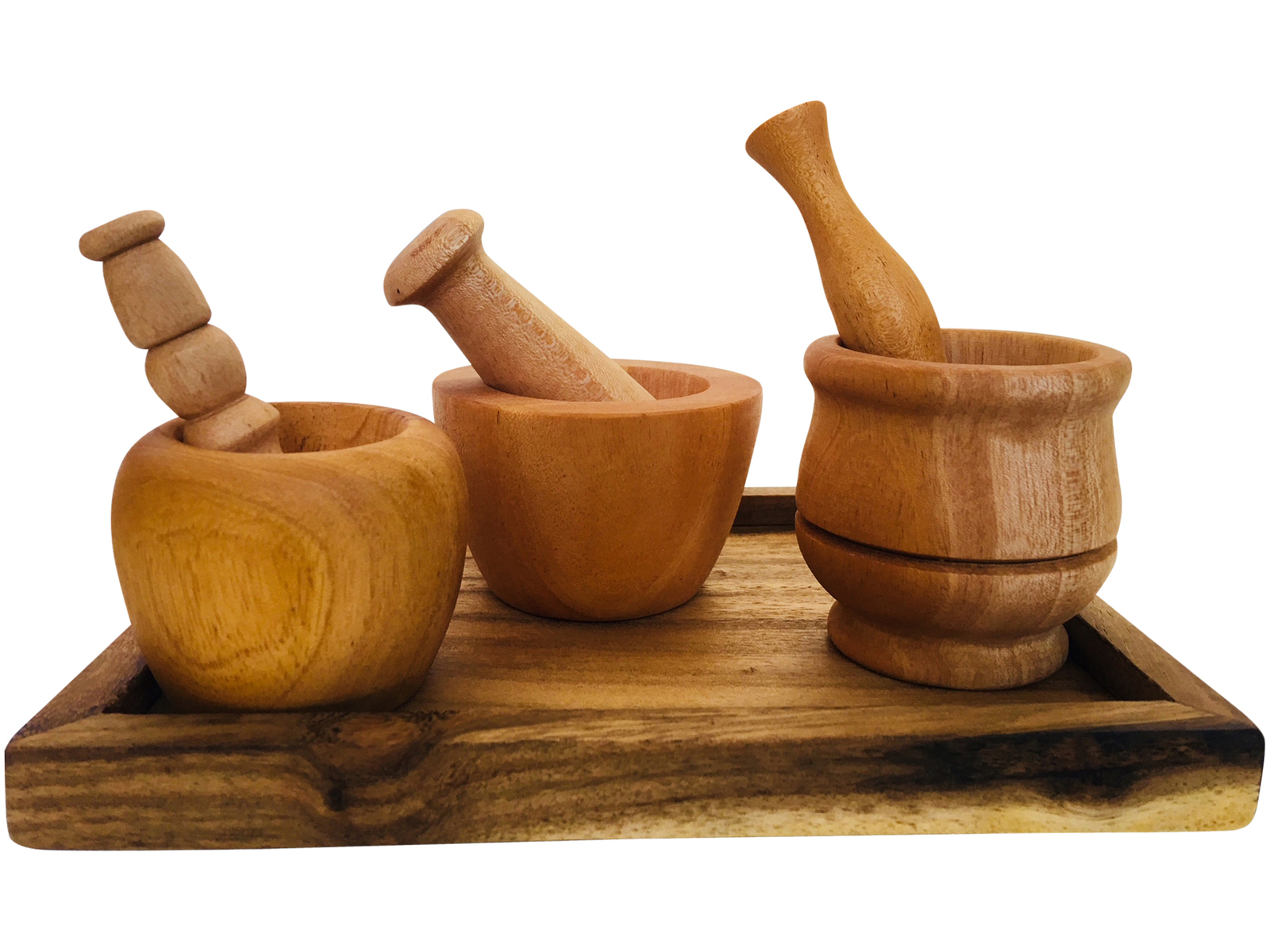 Mortar & pestles are an ancient tool that have existed in one form or another through history where they have been used to crack nuts, grind grains and crush herbs and spices for cooking. These 3 small mortar and pestles come with a tray for convenience.
