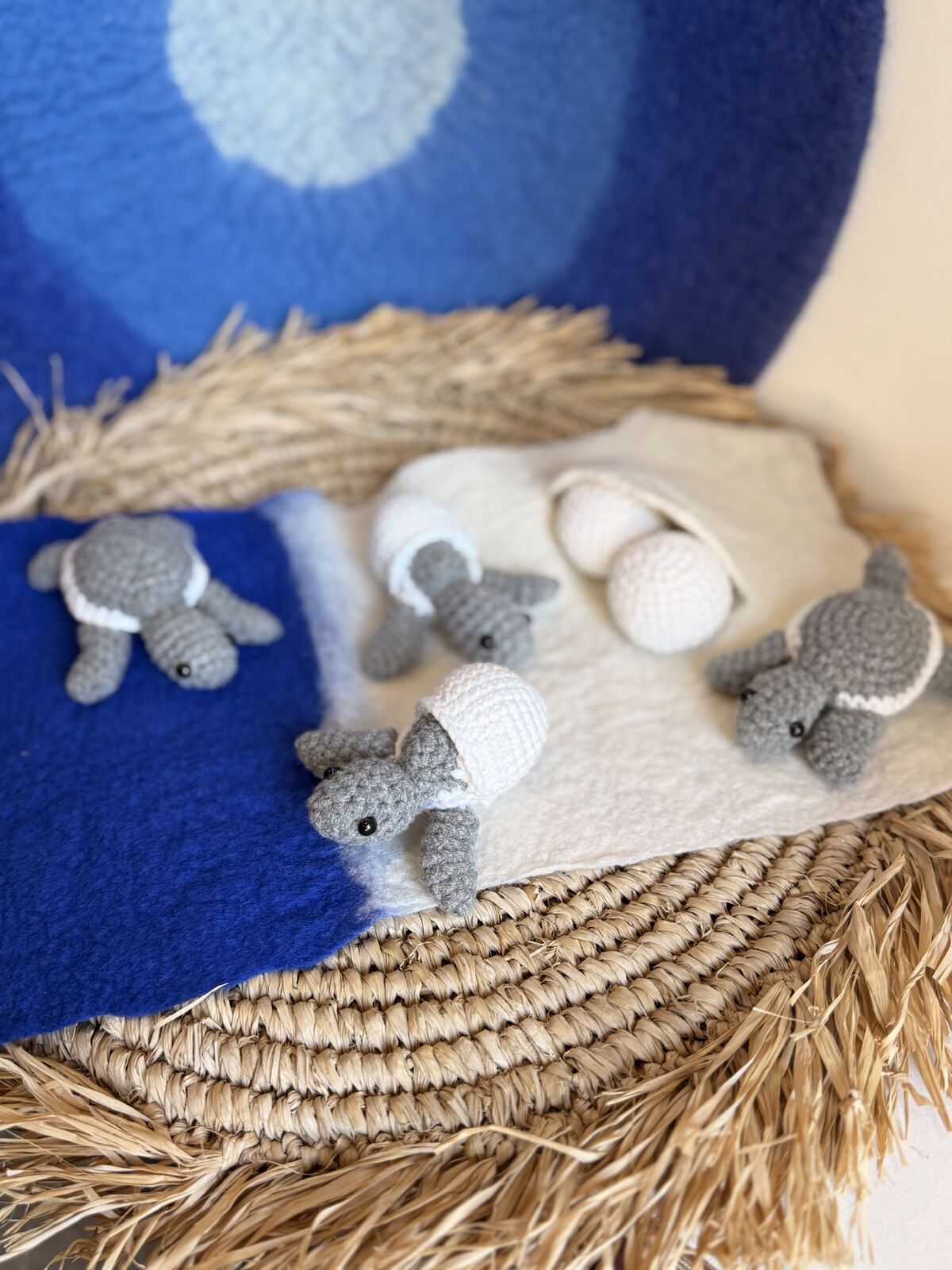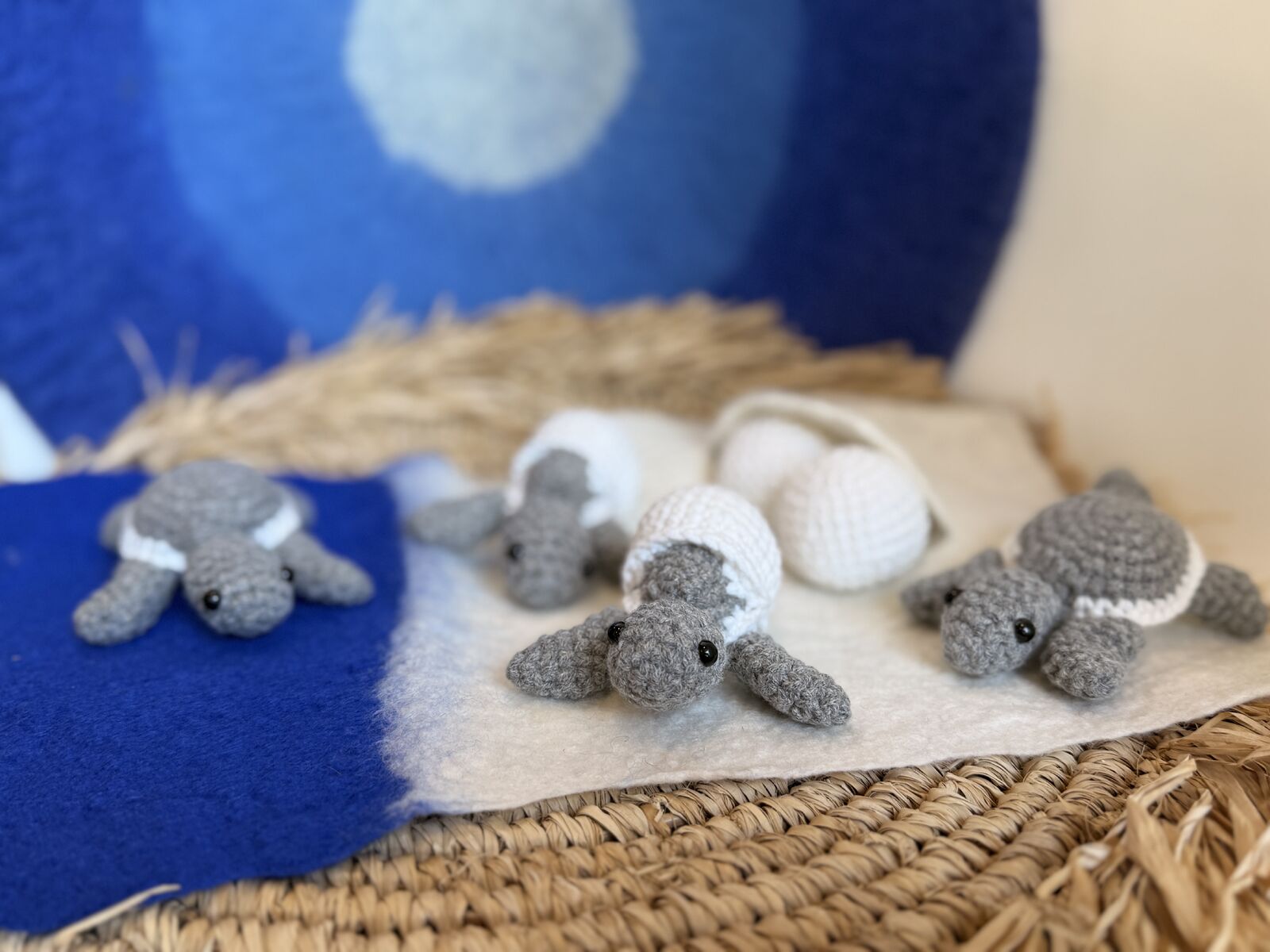 Felted playscape with 2 crochet turtles, 2 hatching turtles and 2 eggs.