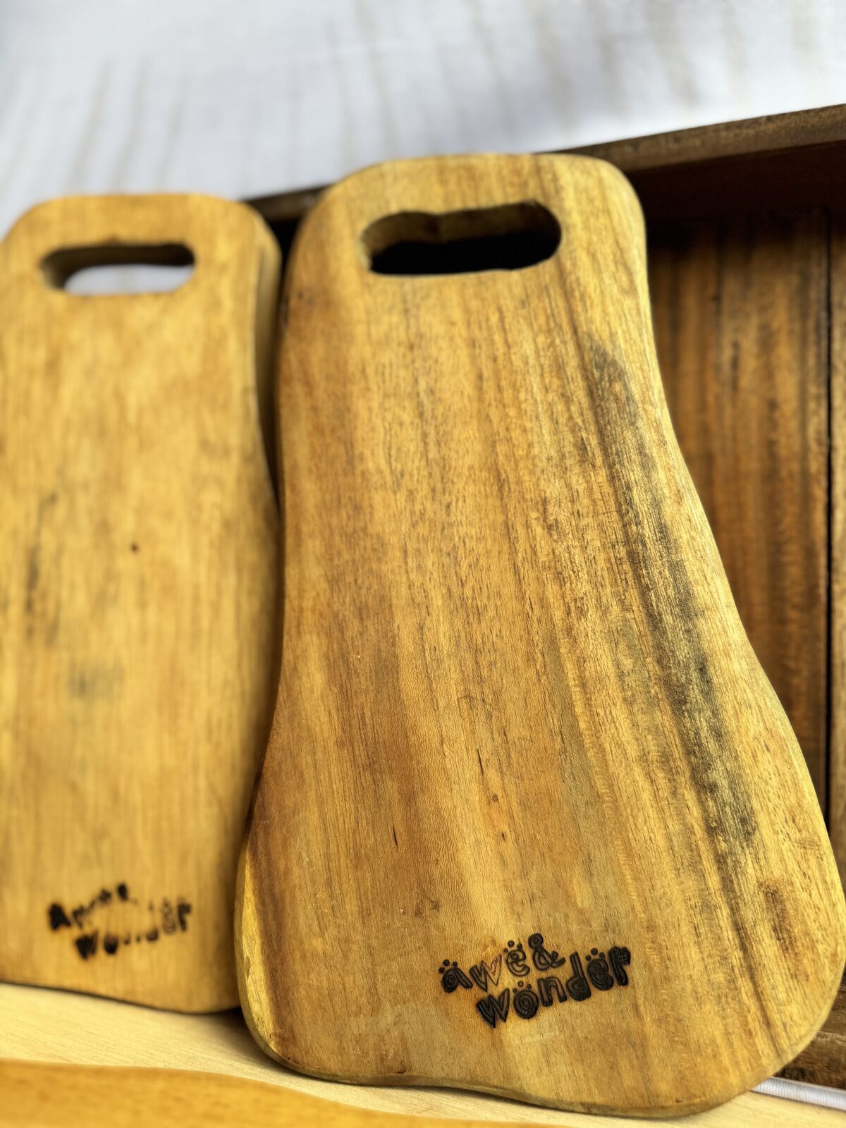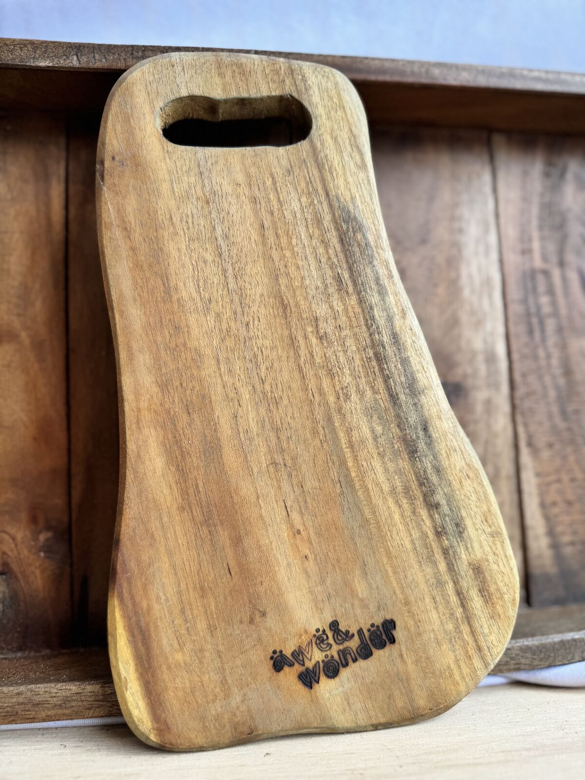 A simple wooden board with a handle, designed for children to confidently prepare and serve their own food. Children can use this board to arrange morning tea, slice soft fruits, spread toppings, prepare sandwiches or carry snacks from the kitchen to the table. The handle makes it easy for small hands to grip and transport, supporting independence and coordination. Ideal for real kitchen experiences, play kitchens, mud kitchens or café-style pretend play, this board encourages practical life skills, fine motor development and a sense of pride as children prepare and share food with others.