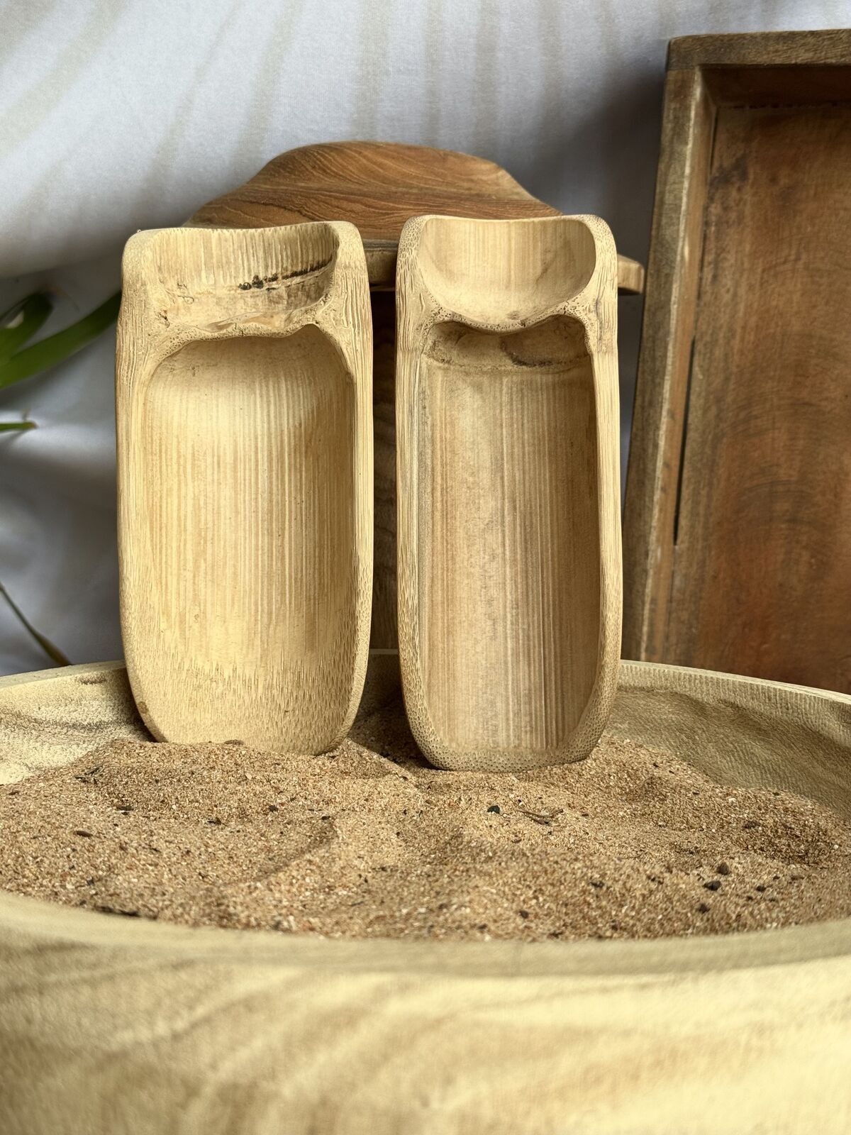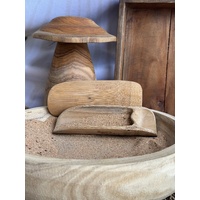 These handcrafted wooden scoops are shaped from natural timber, celebrating simple form and natural texture. Designed for open-ended play, they are perfect for scooping, pouring, and transferring materials such as sand, rice, lentils, water, and other loose parts. Their smooth finish and gentle curves support developing fine motor skills and coordination, while inviting calm, focused engagement. Thoughtfully made from natural materials, these scoops encourage sensory exploration and imaginative play, supporting EYLF outcomes through hands-on learning experiences.